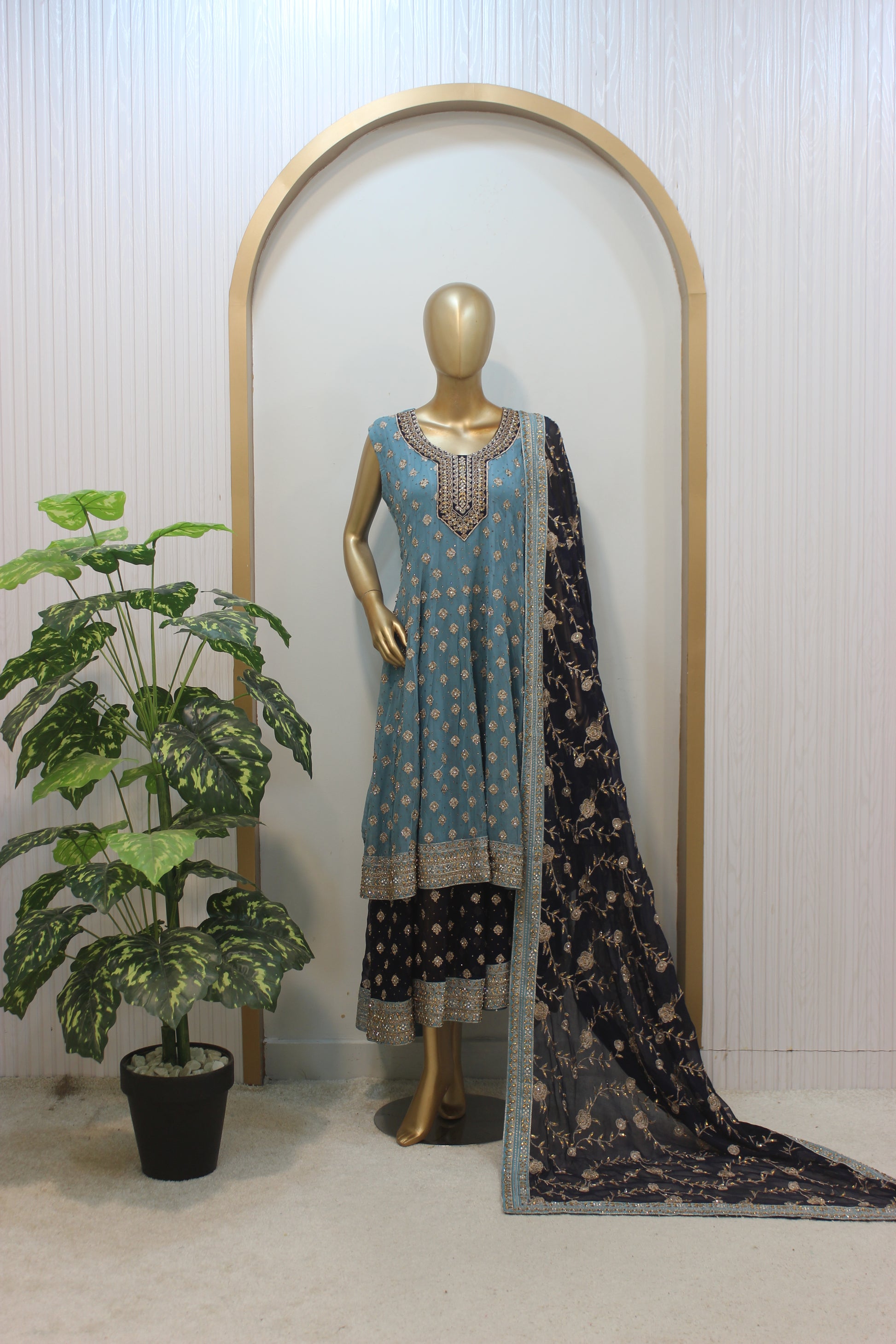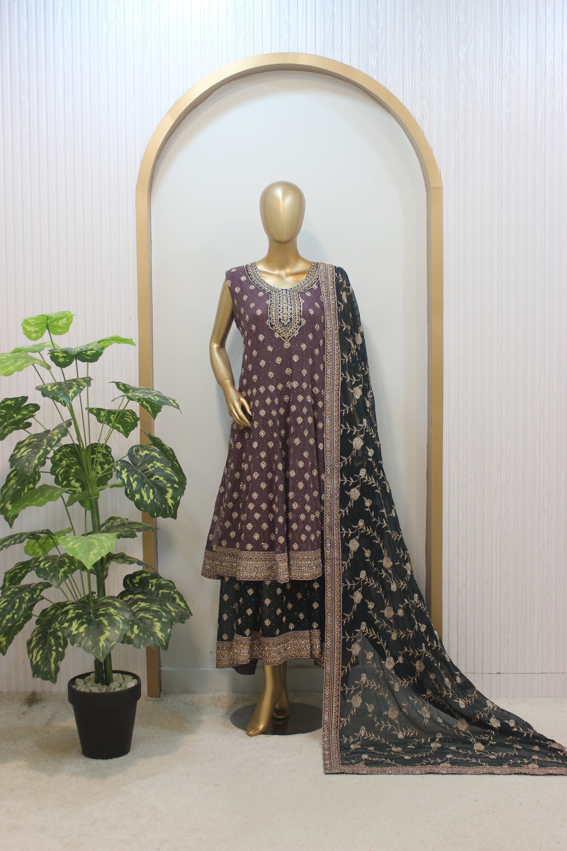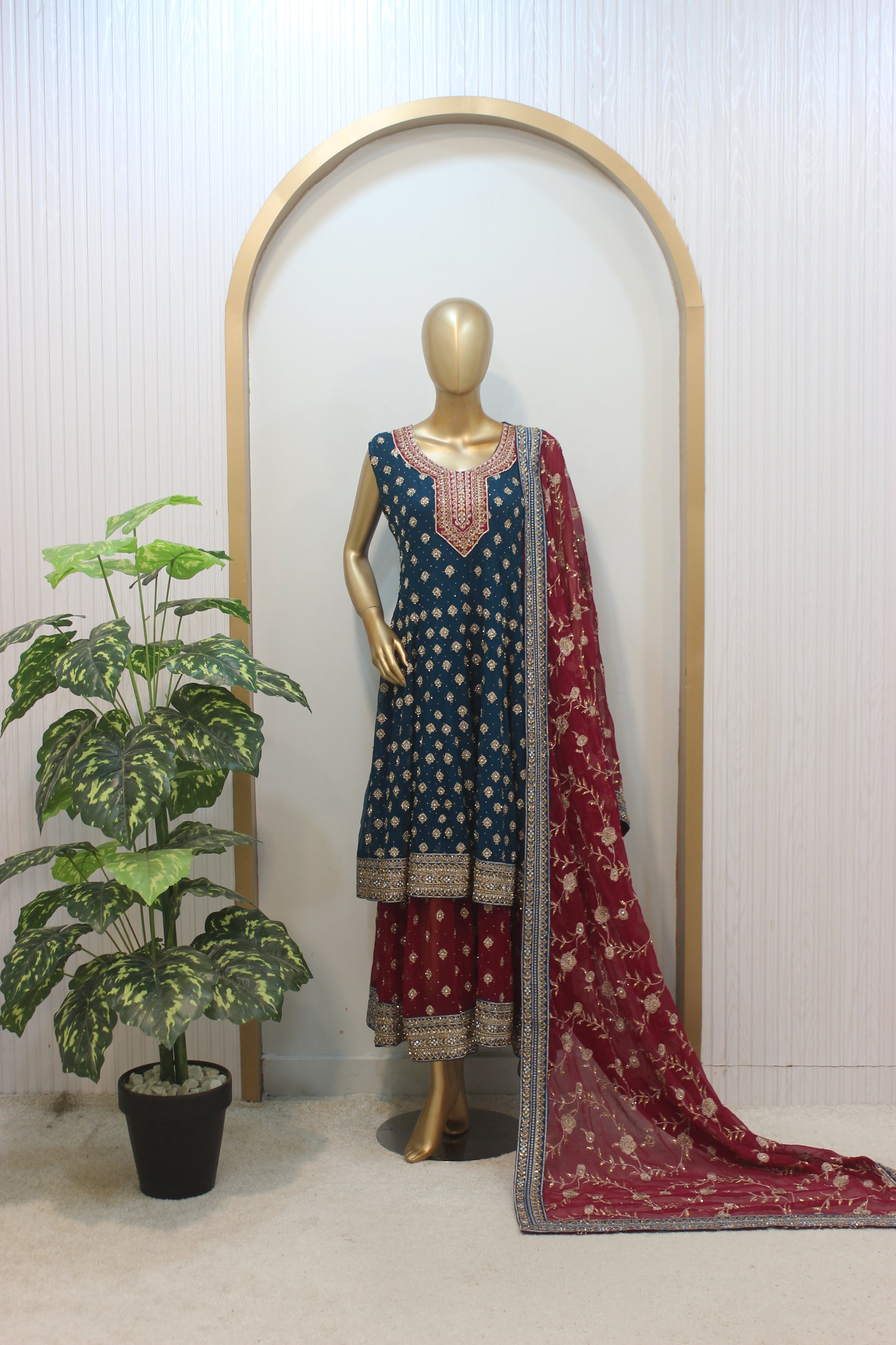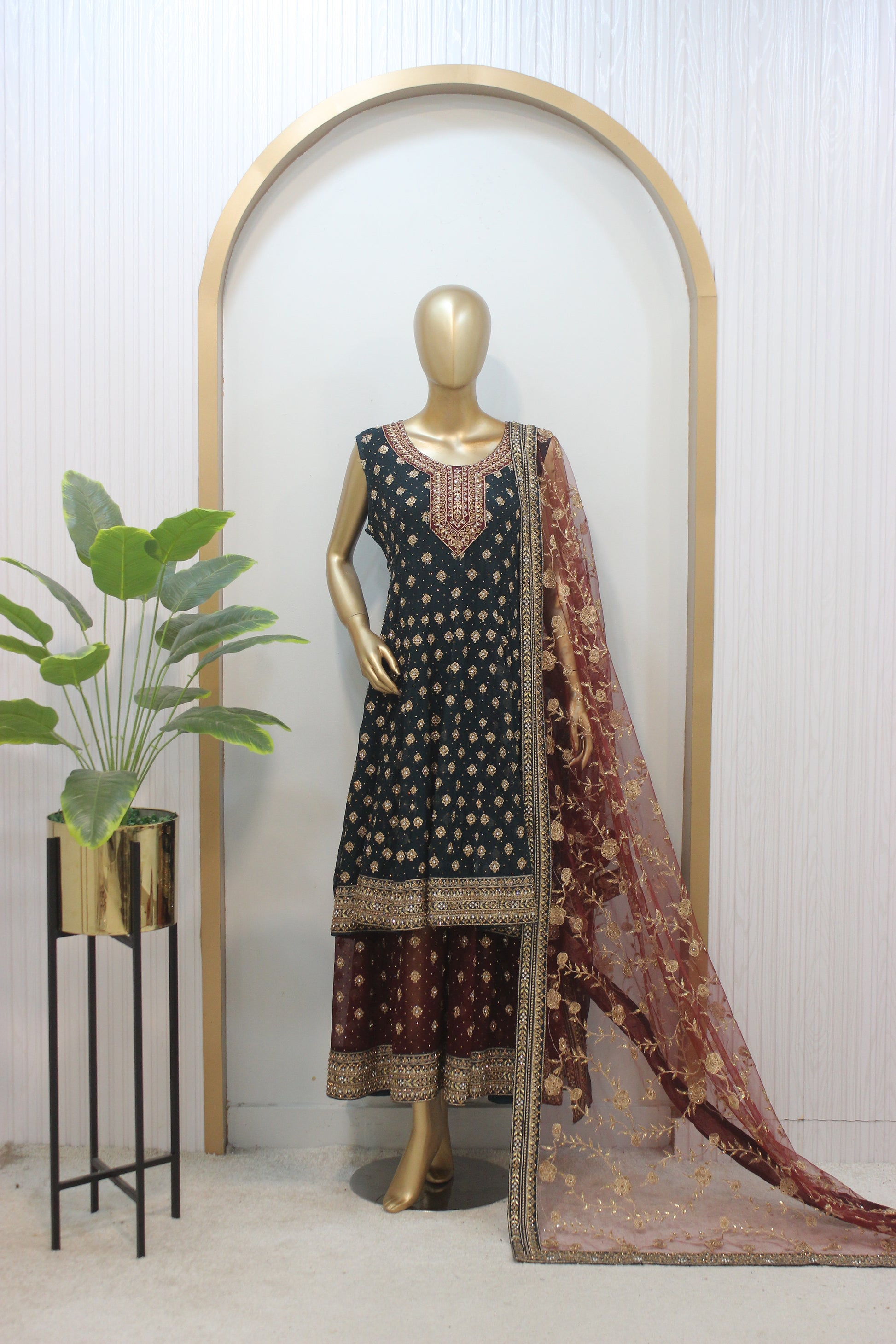 Made from luxurious chiffon fabric, the frock features exquisite zari embroidery paired with pasted stonework, adding just the right amount of sparkle. The contrasting double-step design creates a bold, flowy silhouette that moves beautifully with you.
