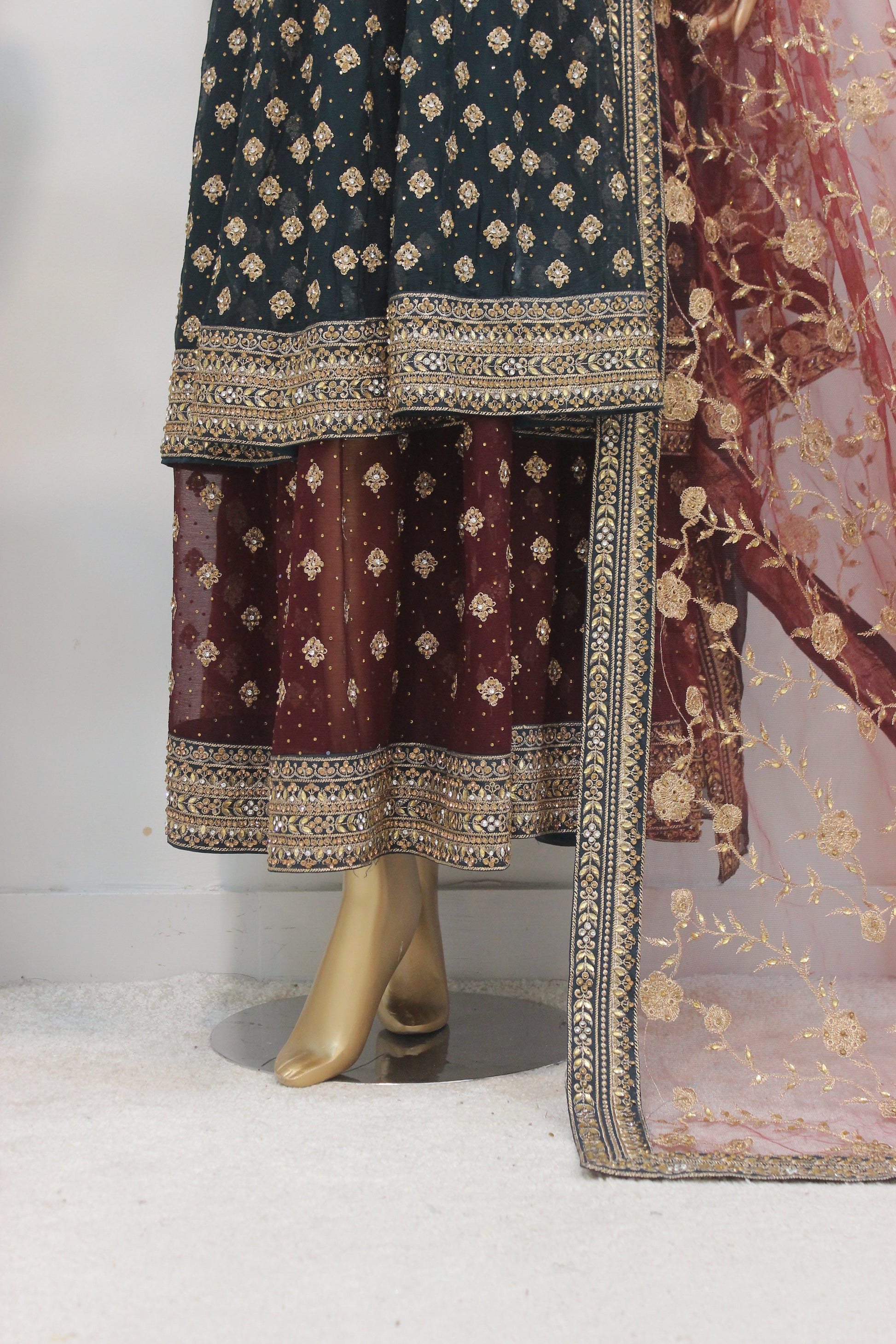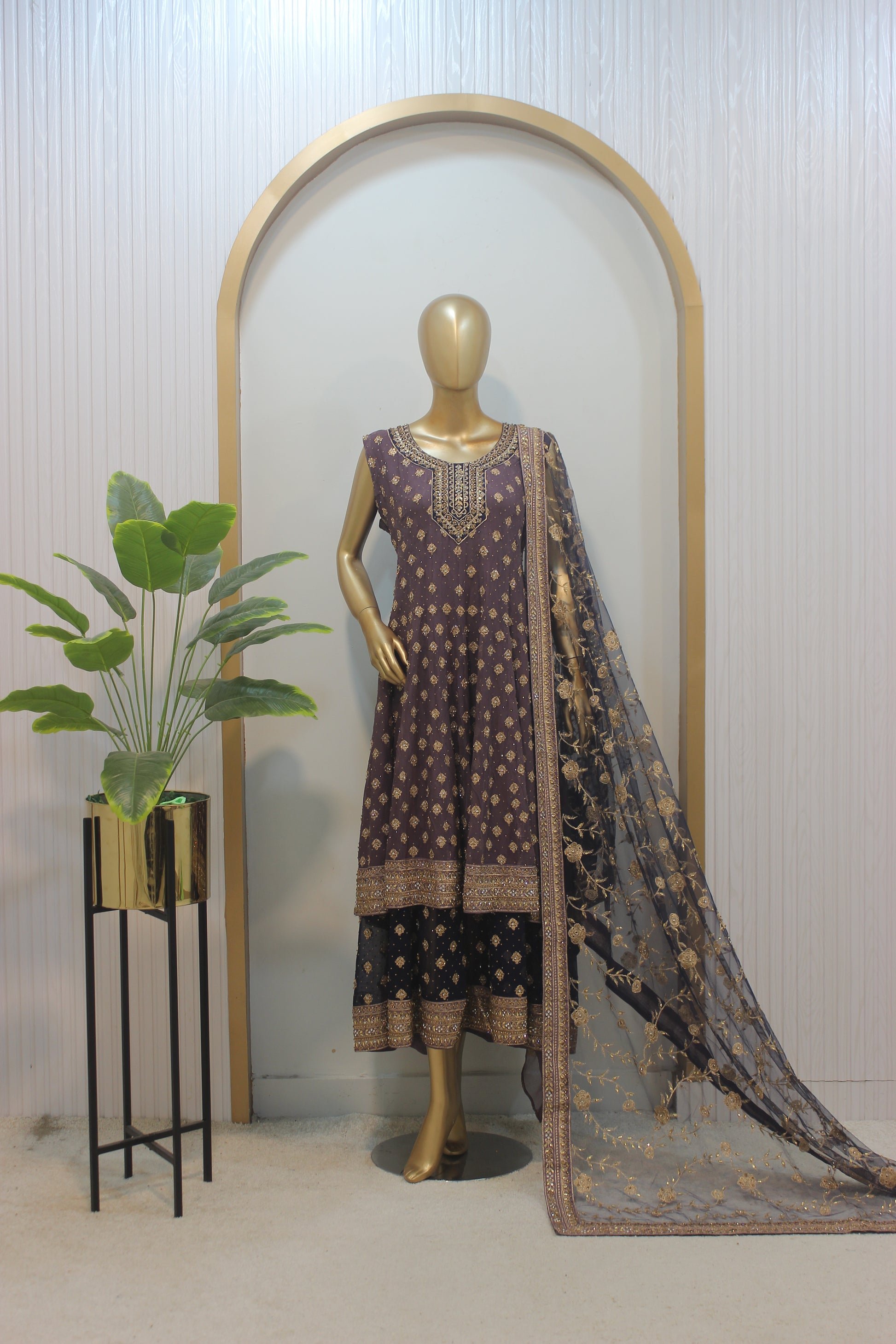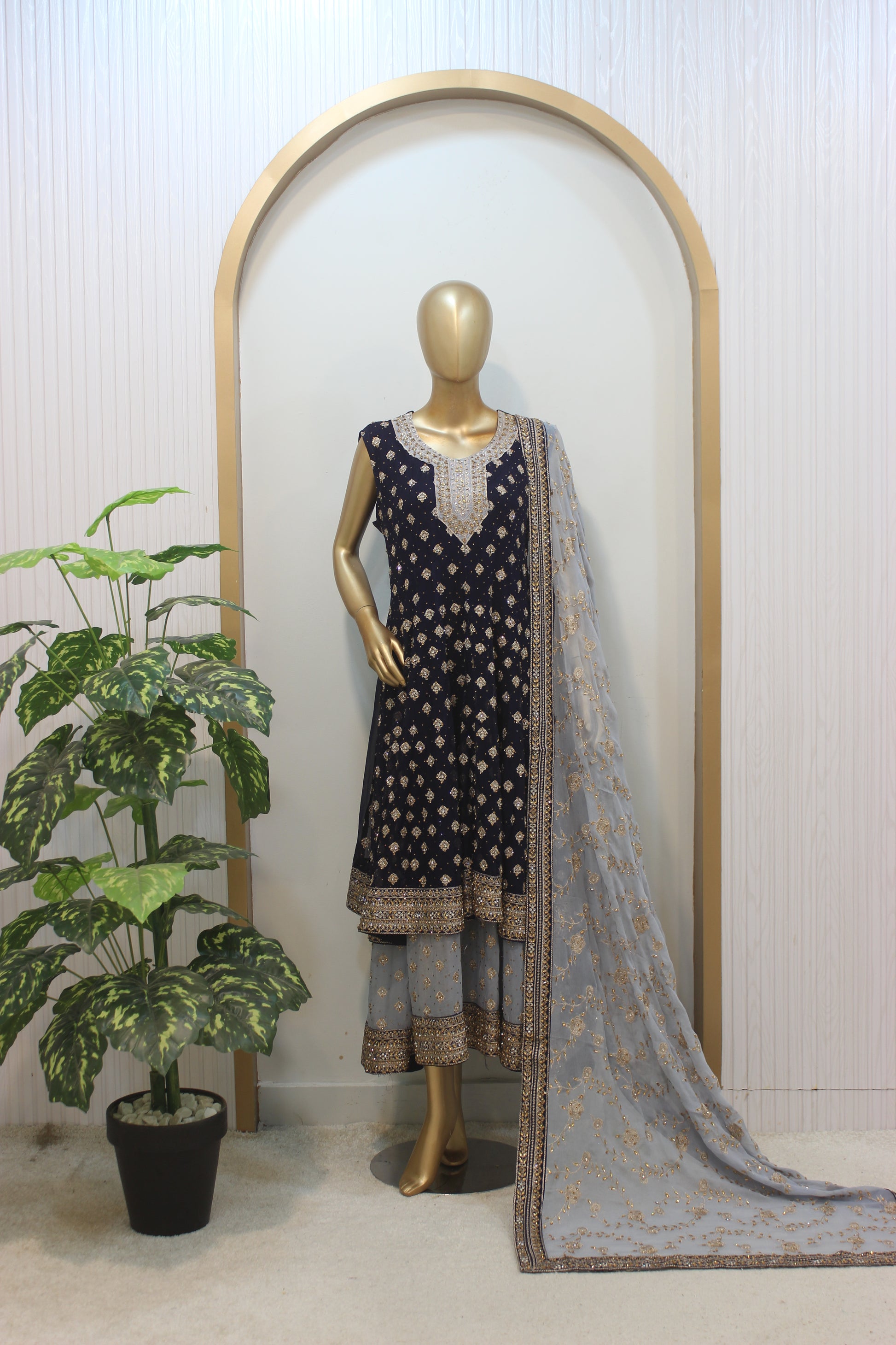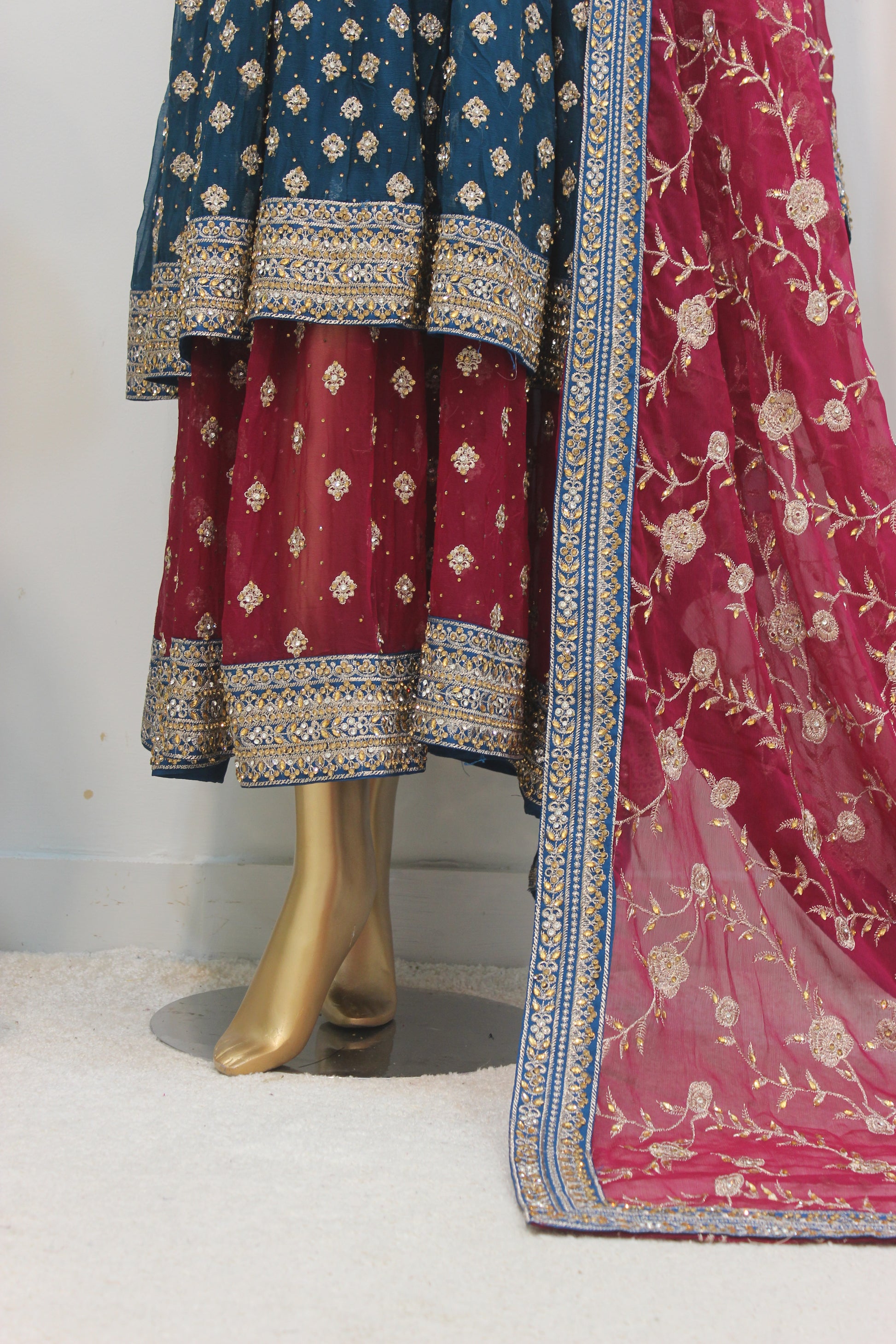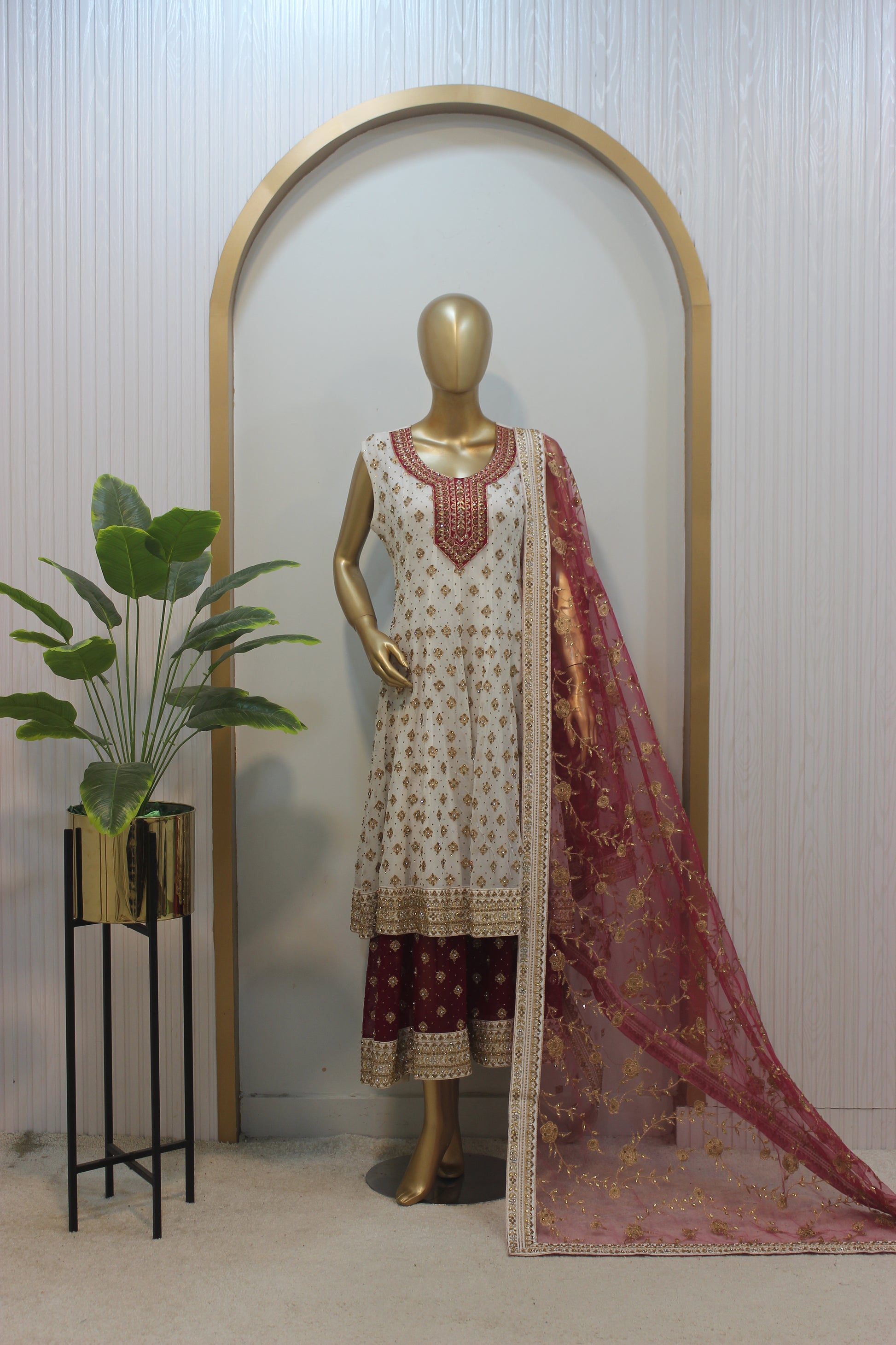 Made from luxurious chiffon fabric, the frock features exquisite zari embroidery paired with pasted stonework, adding just the right amount of sparkle. The contrasting double-step design creates a bold, flowy silhouette that moves beautifully with you.