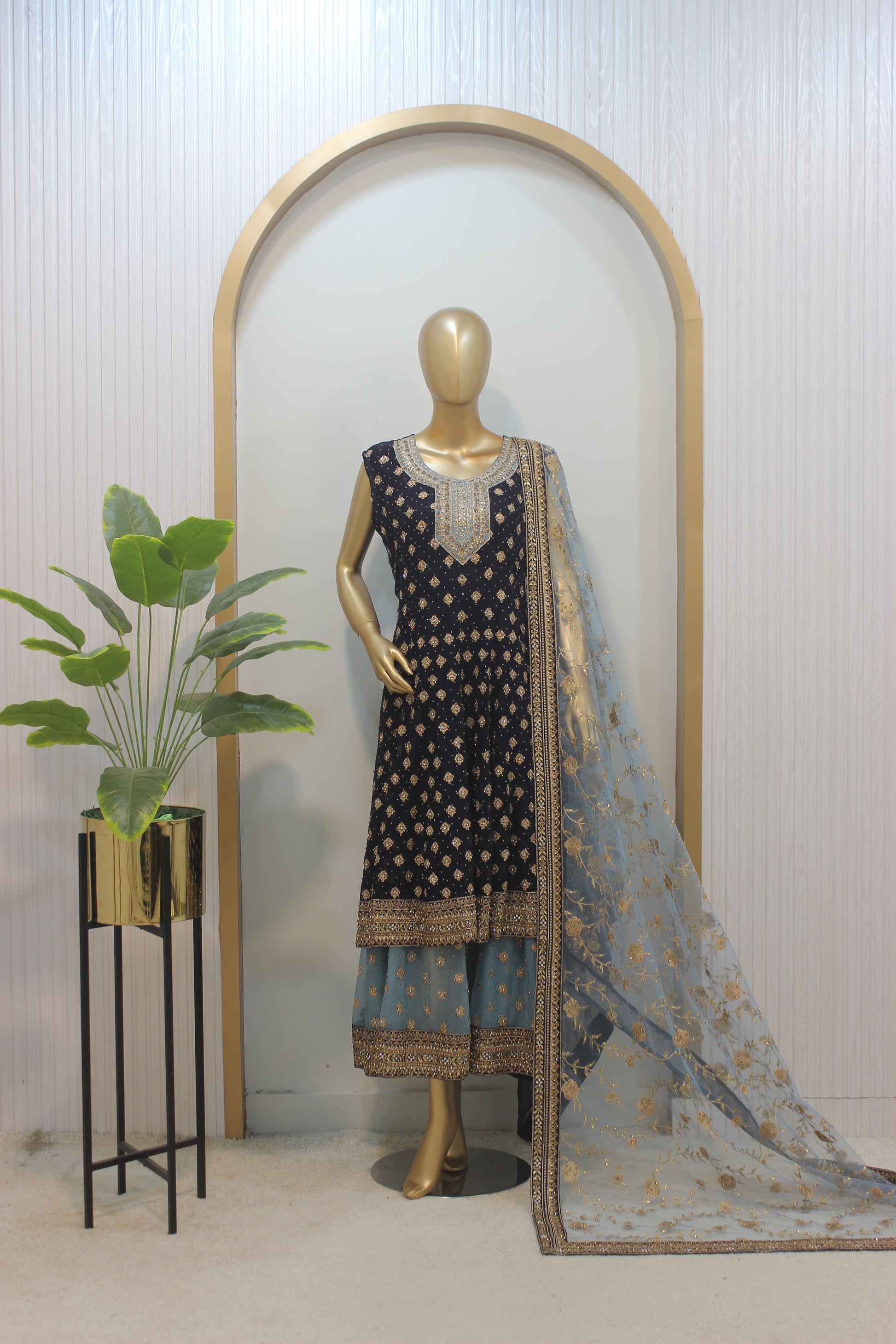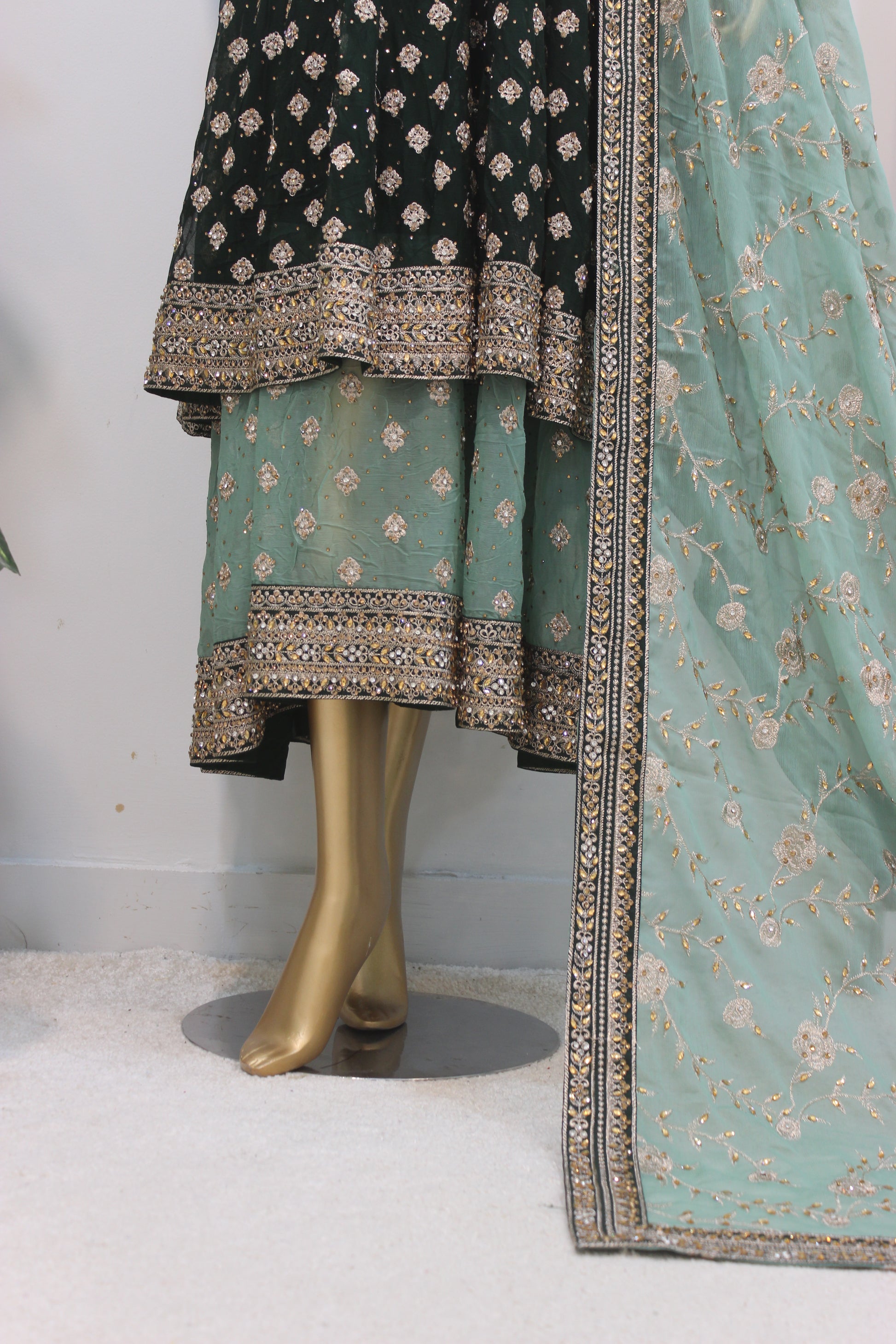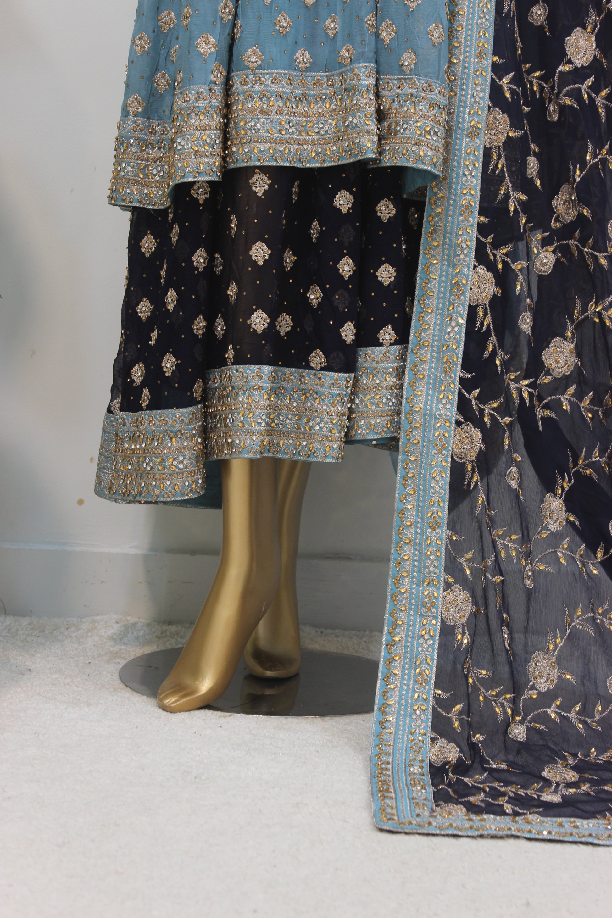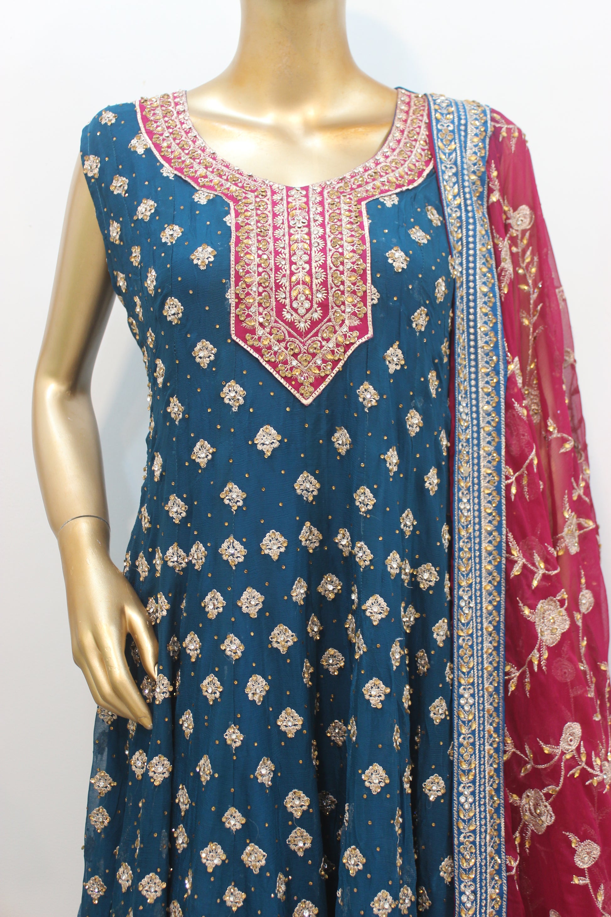 Made from luxurious chiffon fabric, the frock features exquisite zari embroidery paired with pasted stonework, adding just the right amount of sparkle. The contrasting double-step design creates a bold, flowy silhouette that moves beautifully with you.