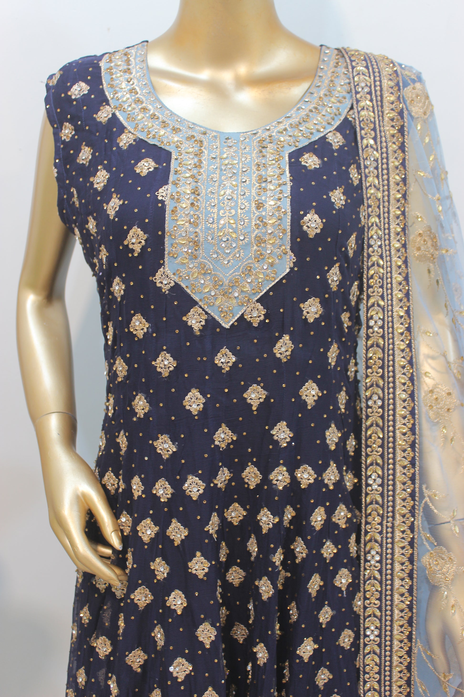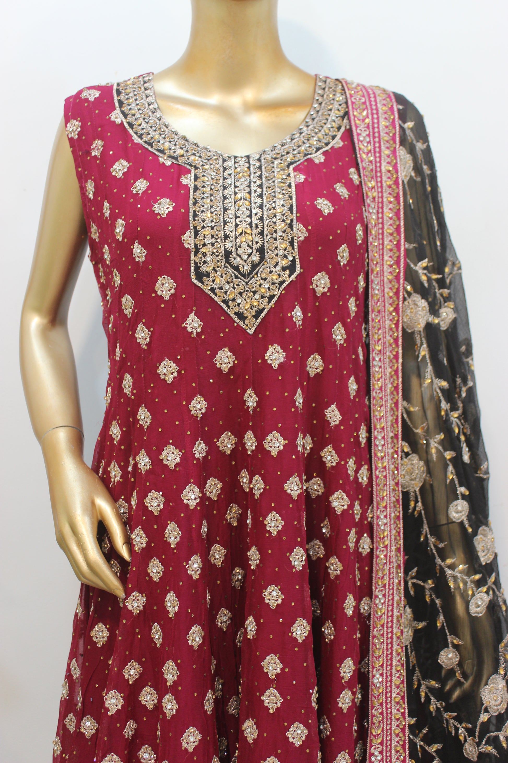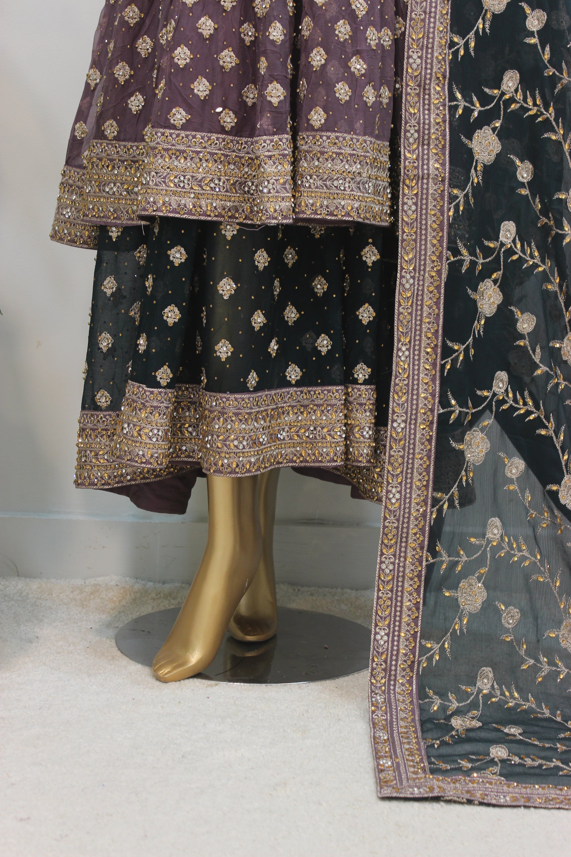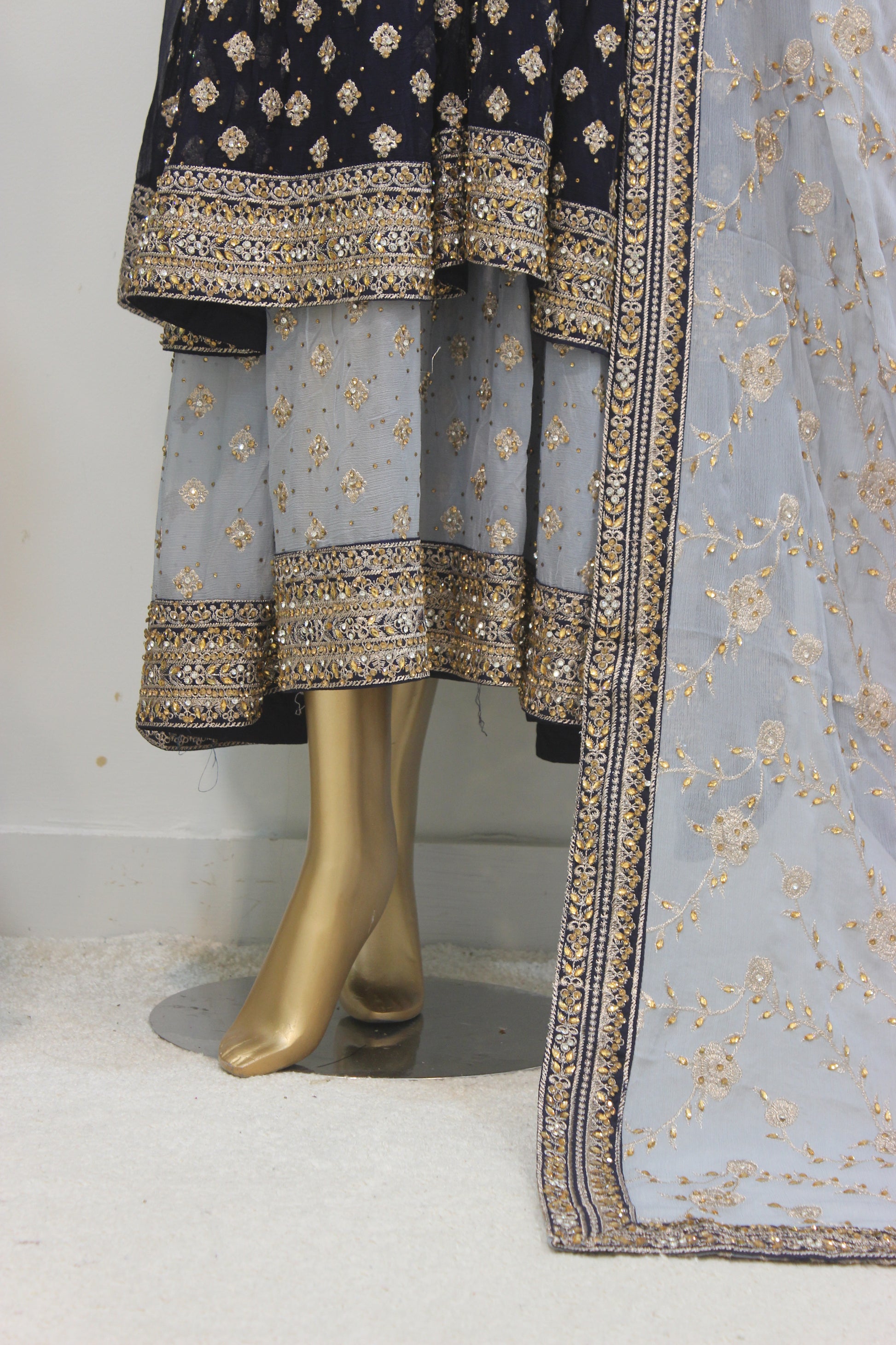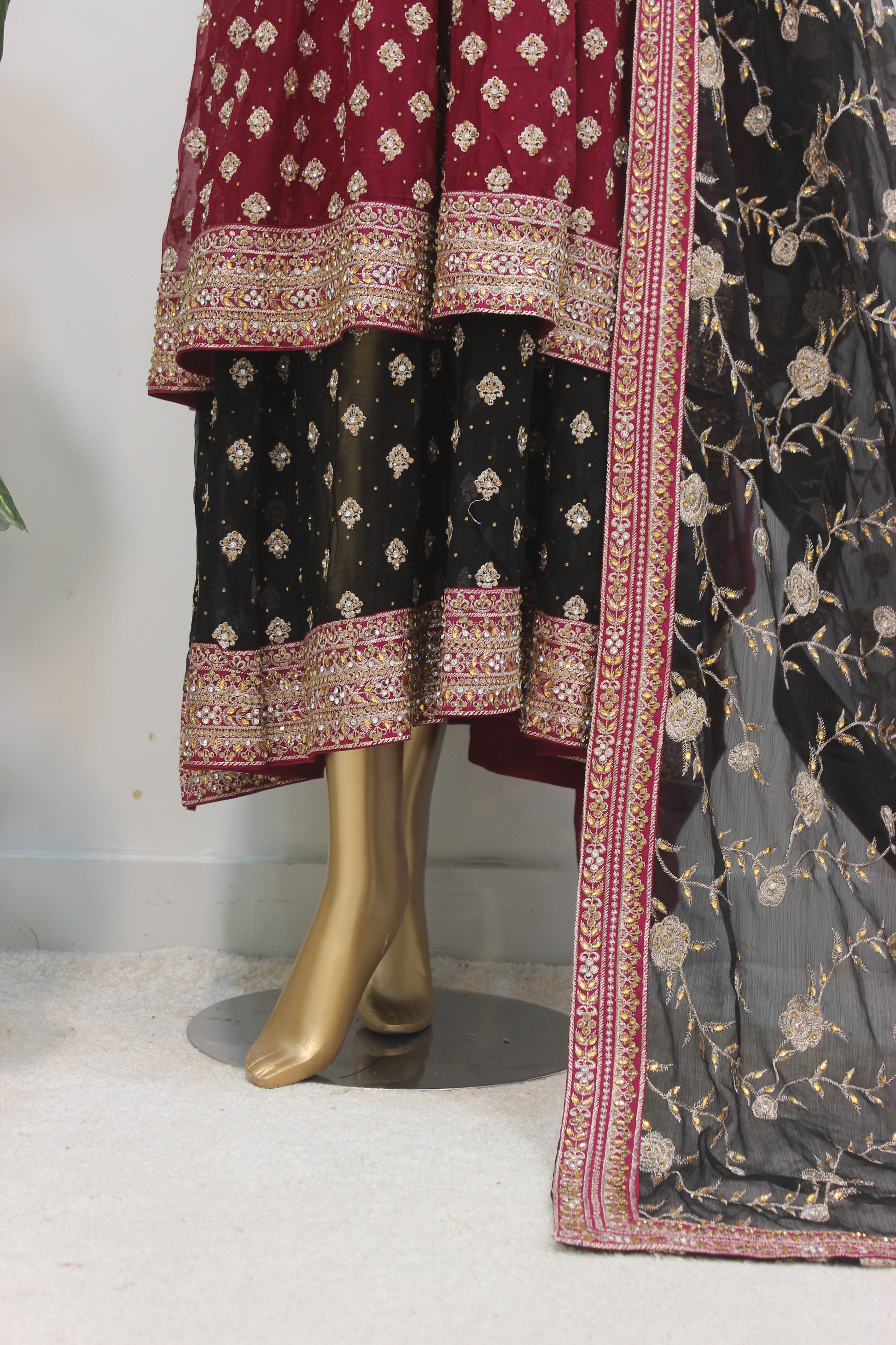 Made from luxurious chiffon fabric, the frock features exquisite zari embroidery paired with pasted stonework, adding just the right amount of sparkle. The contrasting double-step design creates a bold, flowy silhouette that moves beautifully with you.