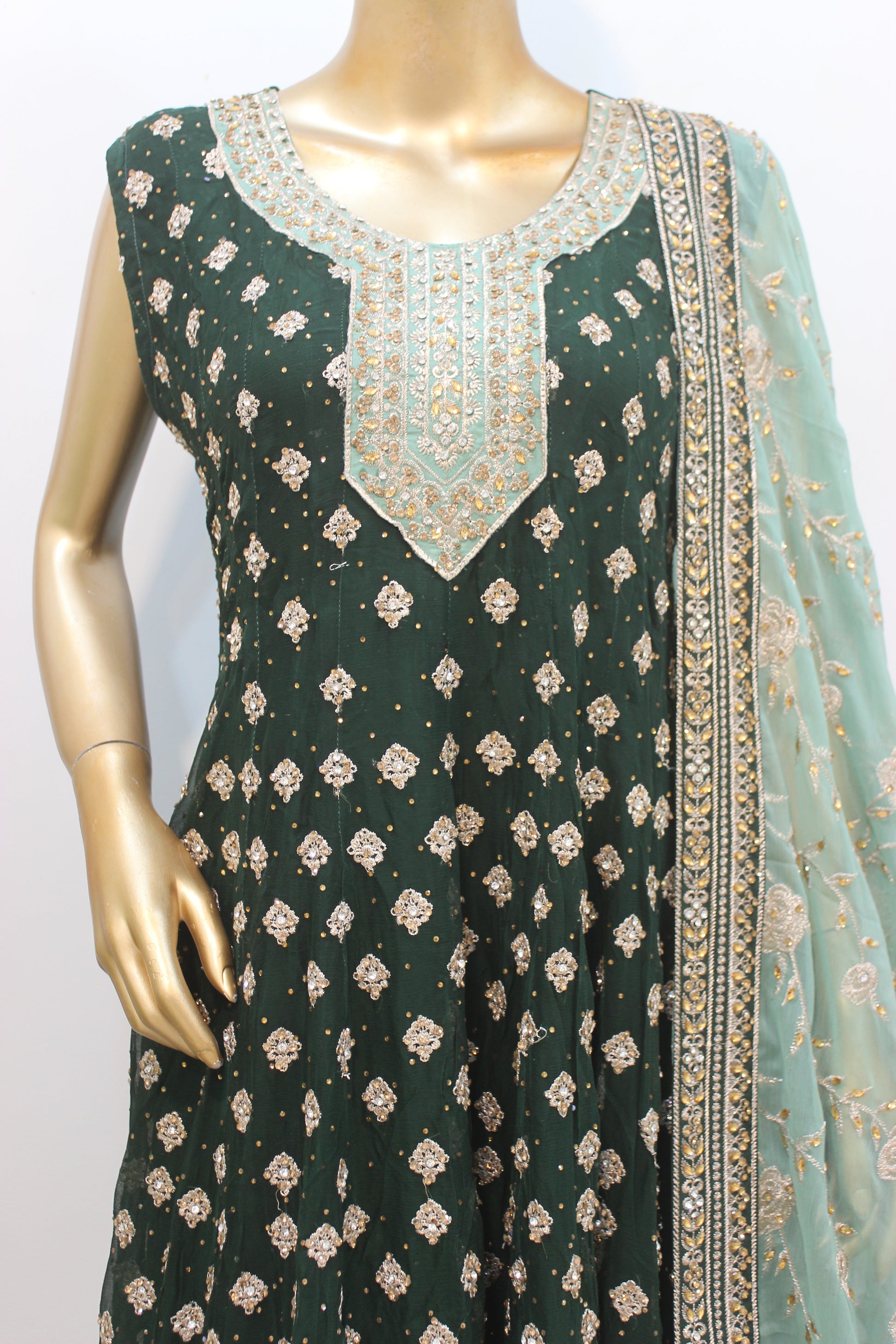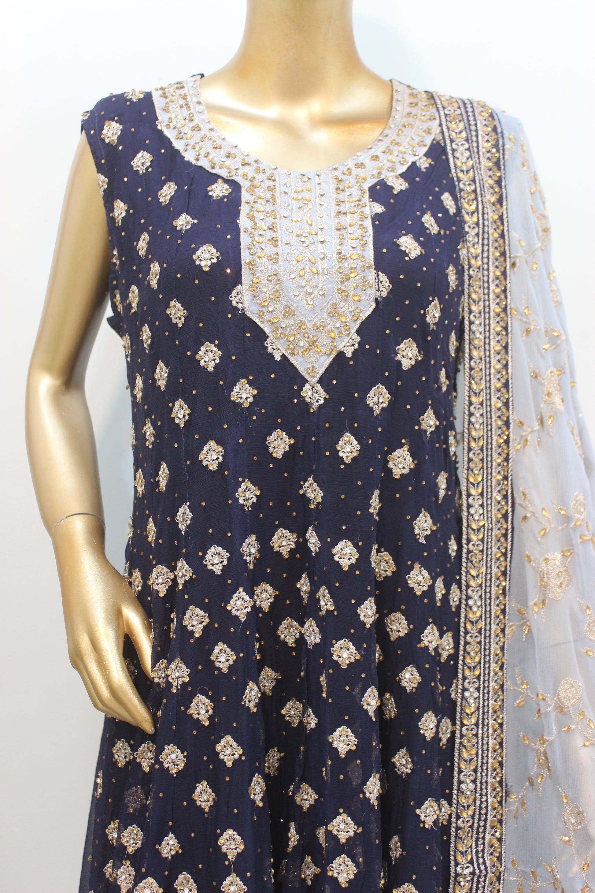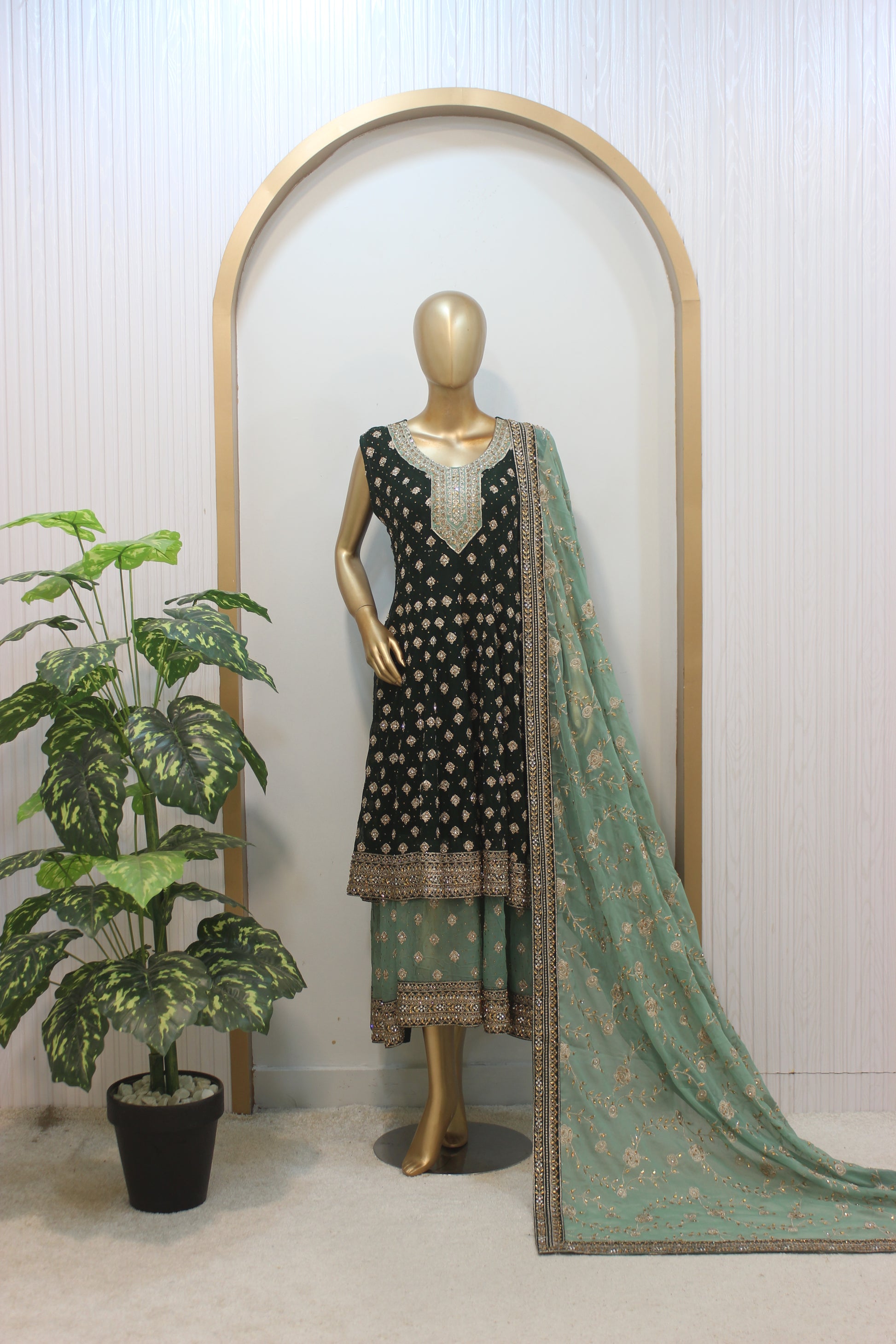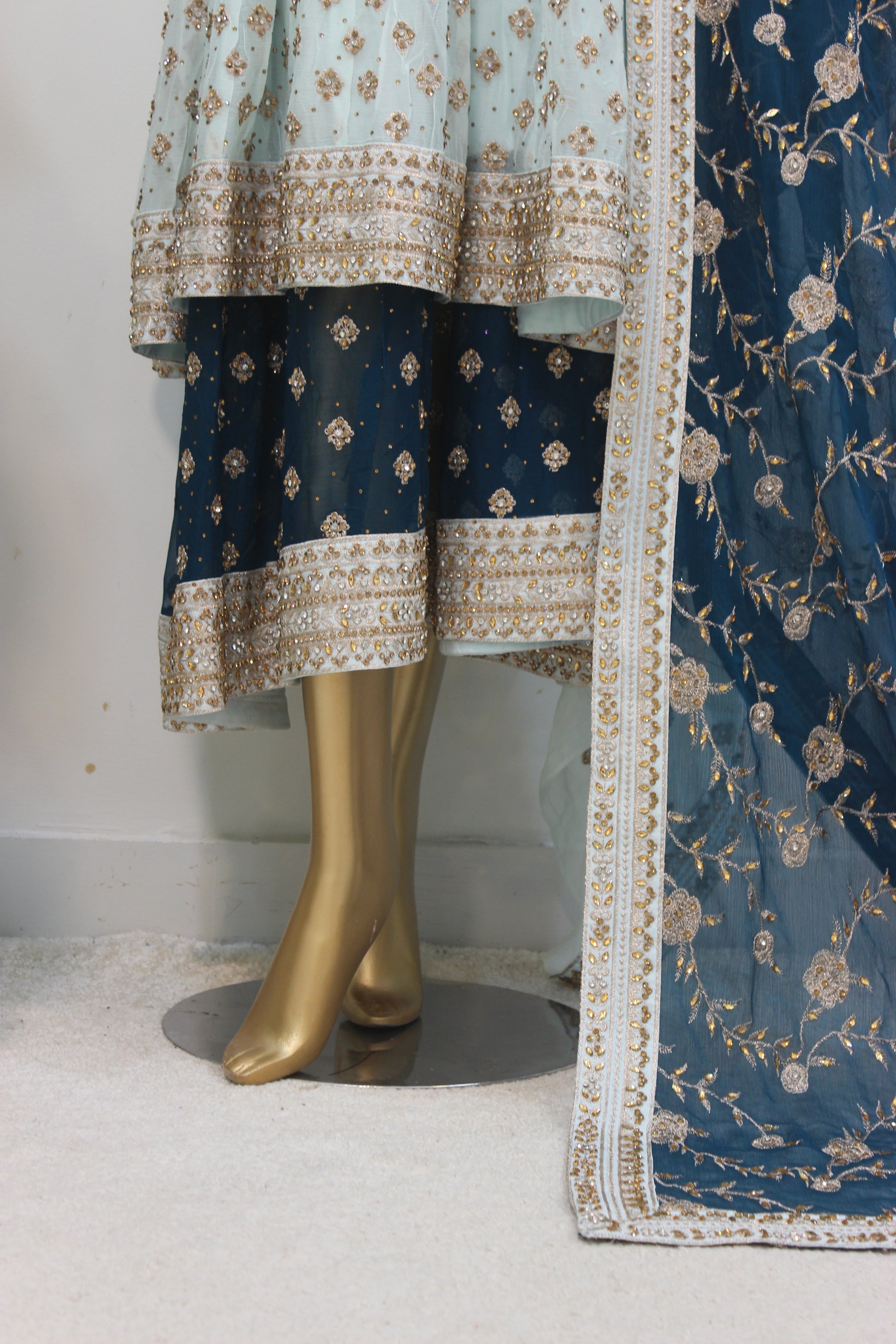 Made from luxurious chiffon fabric, the frock features exquisite zari embroidery paired with pasted stonework, adding just the right amount of sparkle. The contrasting double-step design creates a bold, flowy silhouette that moves beautifully with you.